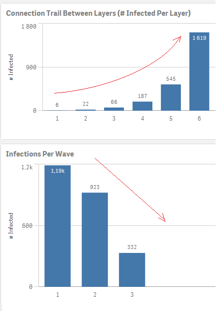 When playing around with one of the chains, 1 person (id:1) was responsible for infecting 307 people only by the 3rd layer!