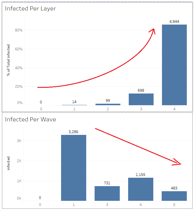 initial layers get infected, by the 4th, 5th,... layer they are not likely to start any new chains.
