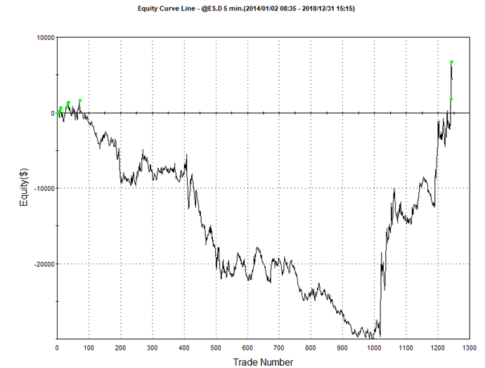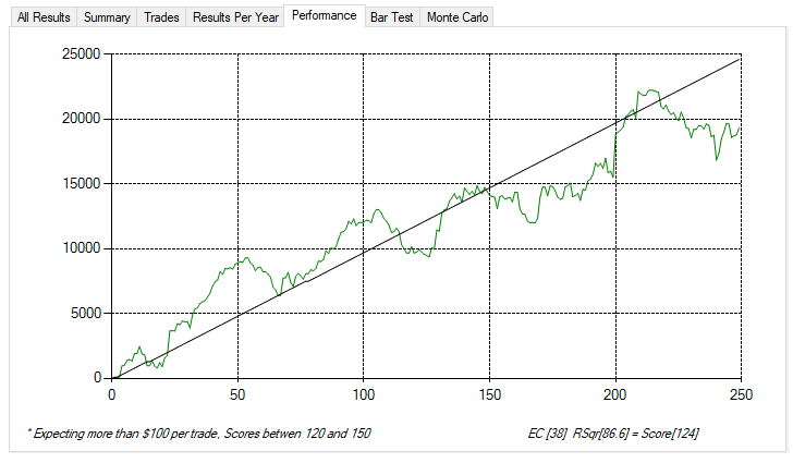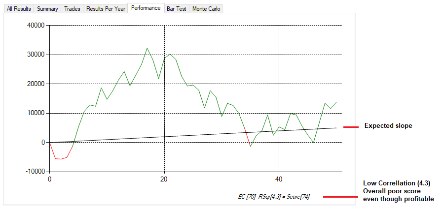 The example below shows a profitable system but a low correlation with the equity curve growth I would've expected